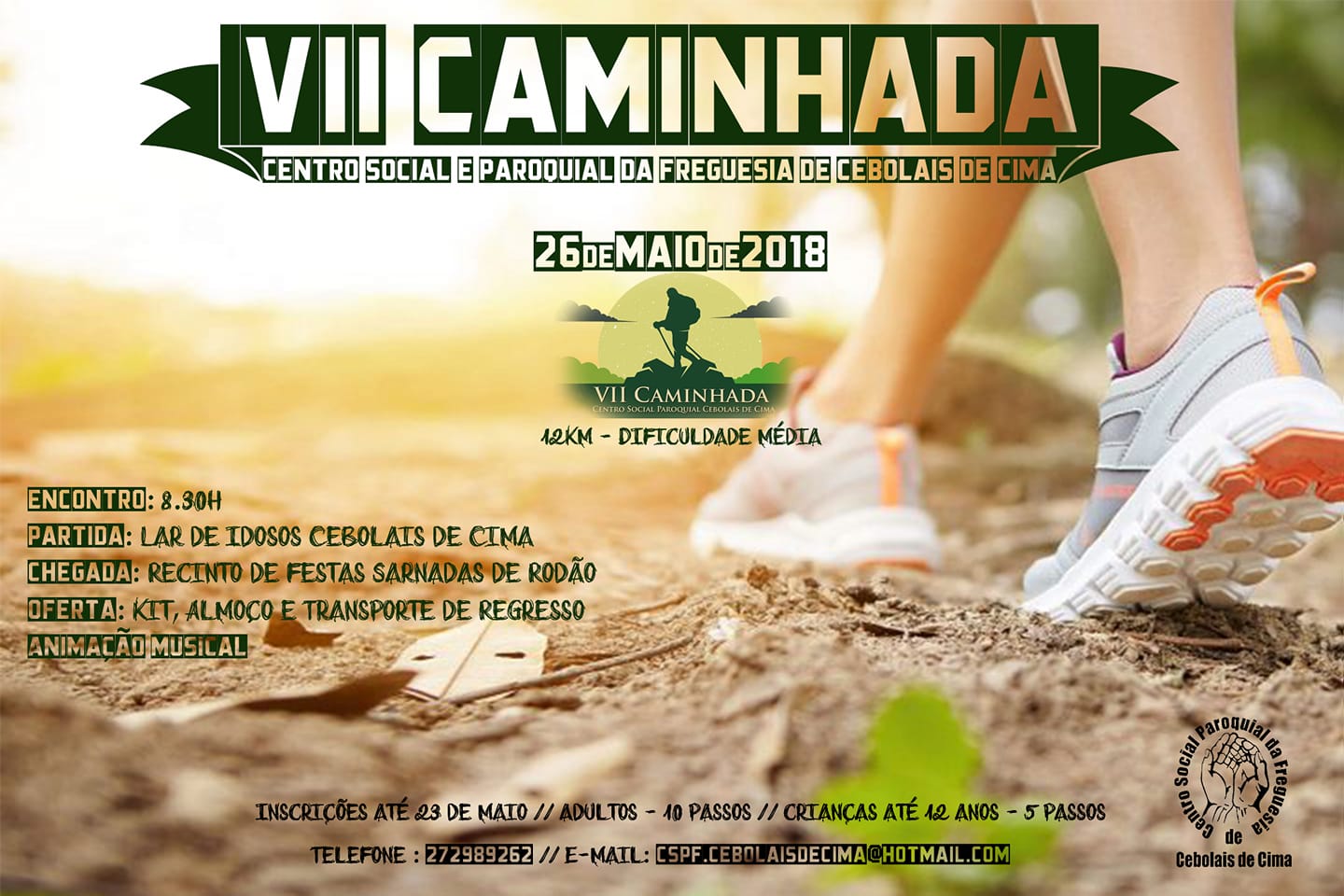 O Centro Social e Paroquial da Freguesia dos Cebolais de Cima vem por este meio apresentar à comunidade a VII Caminhada Anual, que terá inicio no Lar de Idosos dos Cebolais de Cima e terminará no Recinto de Festas de Sarnadas de Rodão (distância a percorrer de 12km). Agradecemos a quem se queira juntar a nós neste dia o favor de se inscrever na Secretaria no Lar.
